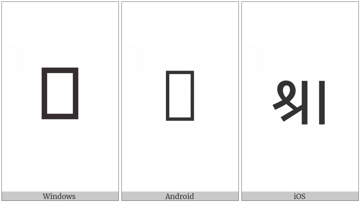 The image below shows how the “Kaithi Letter Aa” symbol might look like on different operating systems. If the font in which this web site is displayed does not contain the symbol and there is no fallback font able to render it, you can use the image below to get an idea of what it should look like.