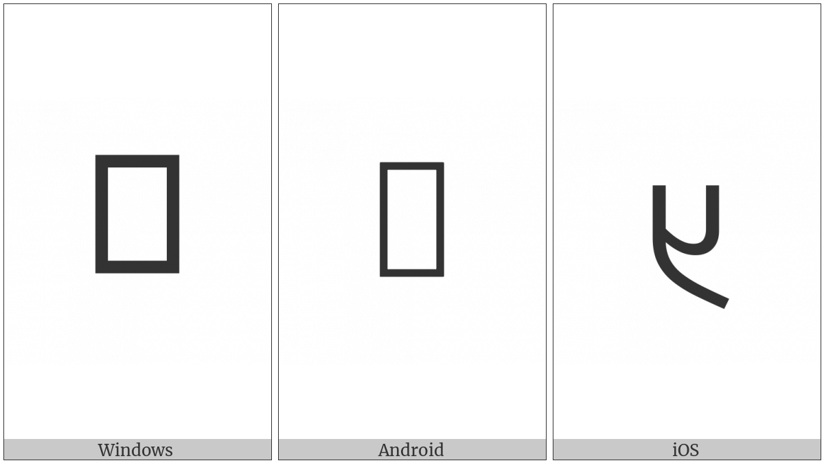 The image below shows how the “Kaithi Letter E” symbol might look like on different operating systems. If the font in which this web site is displayed does not contain the symbol and there is no fallback font able to render it, you can use the image below to get an idea of what it should look like.