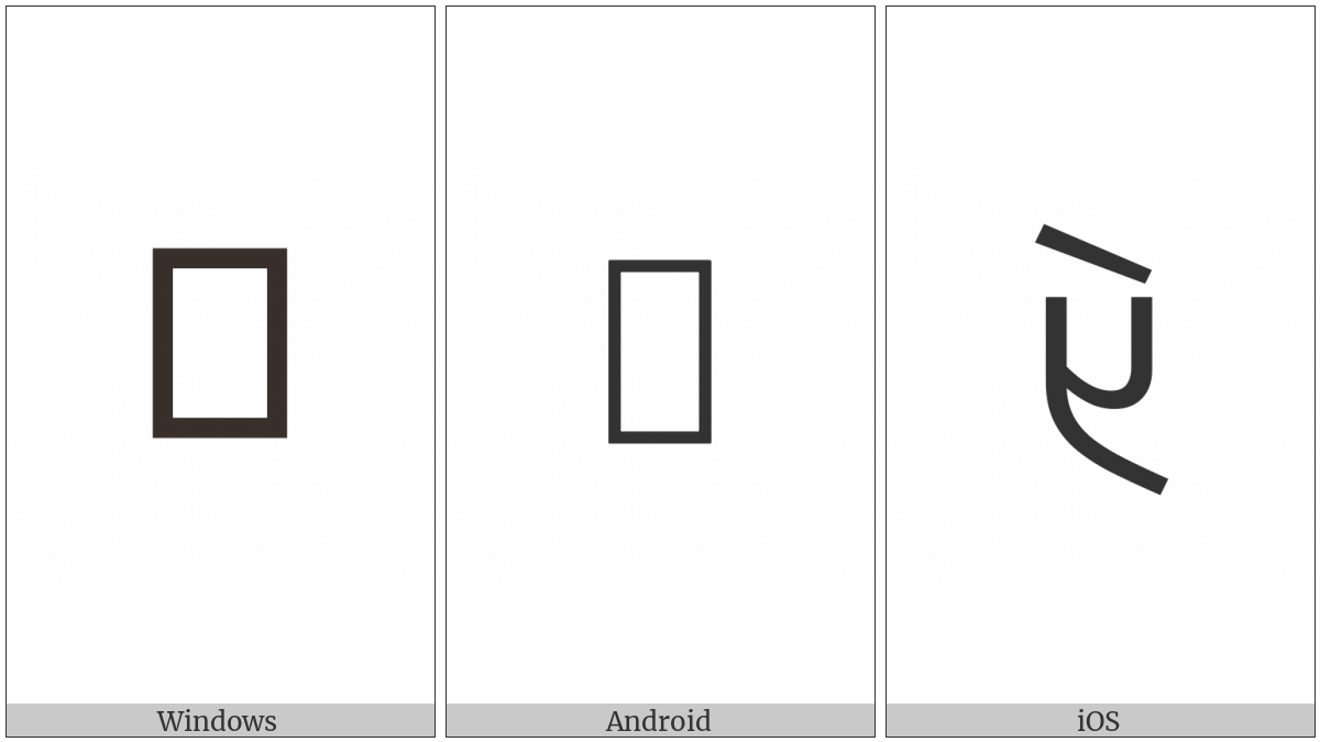 The image below shows how the “Kaithi Letter Ai” symbol might look like on different operating systems. If the font in which this web site is displayed does not contain the symbol and there is no fallback font able to render it, you can use the image below to get an idea of what it should look like.