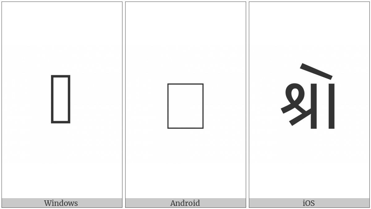 The image below shows how the “Kaithi Letter O” symbol might look like on different operating systems. If the font in which this web site is displayed does not contain the symbol and there is no fallback font able to render it, you can use the image below to get an idea of what it should look like.