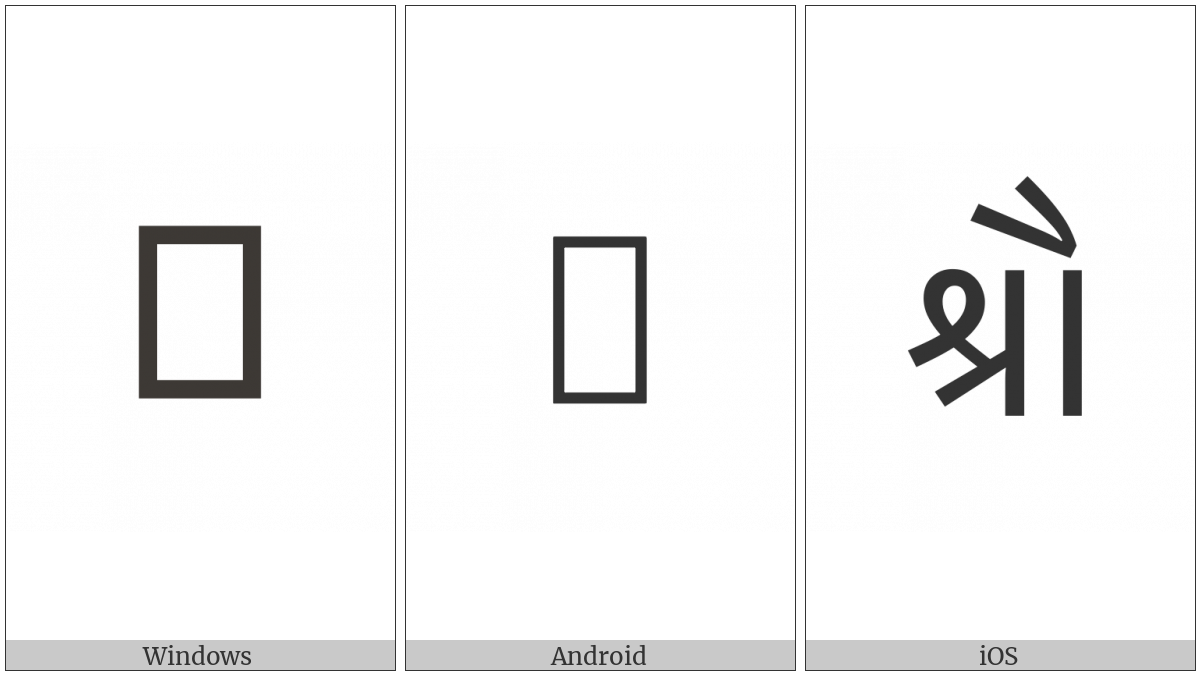 The image below shows how the “Kaithi Letter Au” symbol might look like on different operating systems. If the font in which this web site is displayed does not contain the symbol and there is no fallback font able to render it, you can use the image below to get an idea of what it should look like.