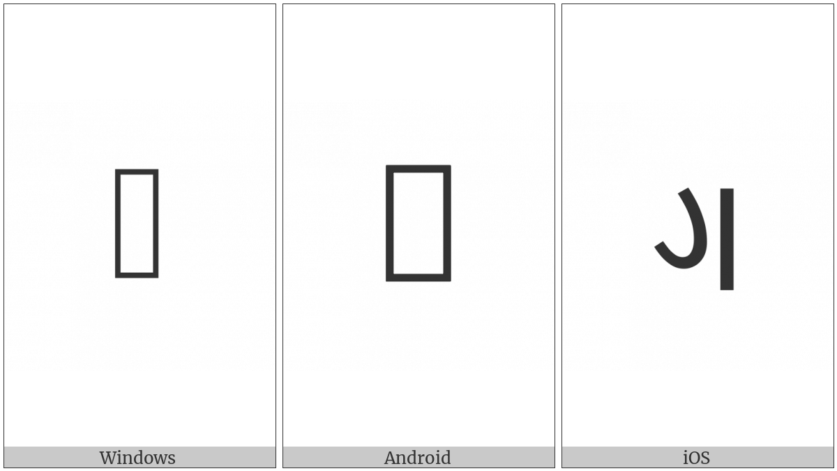 The image below shows how the “Kaithi Letter Ga” symbol might look like on different operating systems. If the font in which this web site is displayed does not contain the symbol and there is no fallback font able to render it, you can use the image below to get an idea of what it should look like.