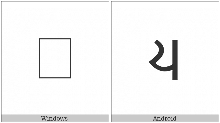 The image below shows how the “Kaithi Letter Ca” symbol might look like on different operating systems. If the font in which this web site is displayed does not contain the symbol and there is no fallback font able to render it, you can use the image below to get an idea of what it should look like.