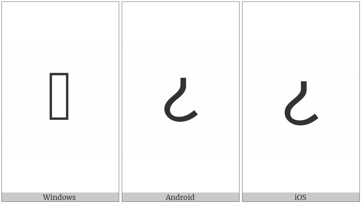 The image below shows how the “Kaithi Letter Tta” symbol might look like on different operating systems. If the font in which this web site is displayed does not contain the symbol and there is no fallback font able to render it, you can use the image below to get an idea of what it should look like.