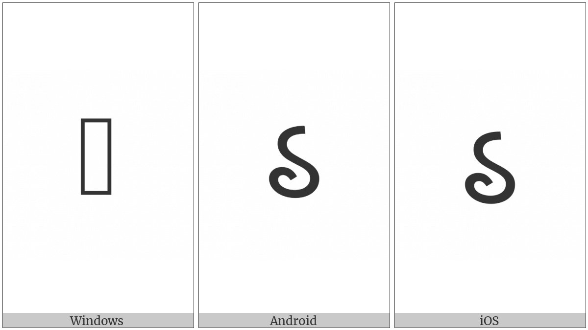 The image below shows how the “Kaithi Letter Ttha” symbol might look like on different operating systems. If the font in which this web site is displayed does not contain the symbol and there is no fallback font able to render it, you can use the image below to get an idea of what it should look like.