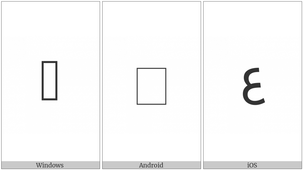 The image below shows how the “Kaithi Letter Da” symbol might look like on different operating systems. If the font in which this web site is displayed does not contain the symbol and there is no fallback font able to render it, you can use the image below to get an idea of what it should look like.
