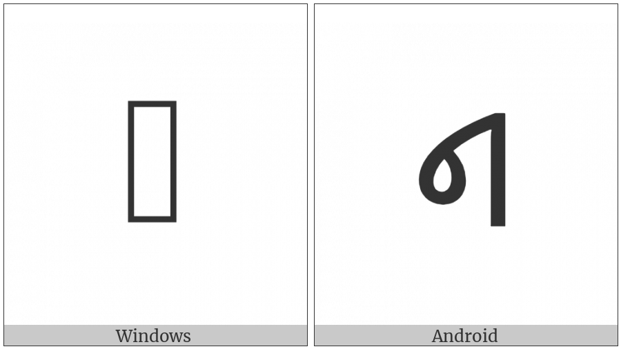 The image below shows how the “Kaithi Letter Na” symbol might look like on different operating systems. If the font in which this web site is displayed does not contain the symbol and there is no fallback font able to render it, you can use the image below to get an idea of what it should look like.