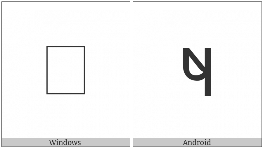 The image below shows how the “Kaithi Letter Ssa” symbol might look like on different operating systems. If the font in which this web site is displayed does not contain the symbol and there is no fallback font able to render it, you can use the image below to get an idea of what it should look like.