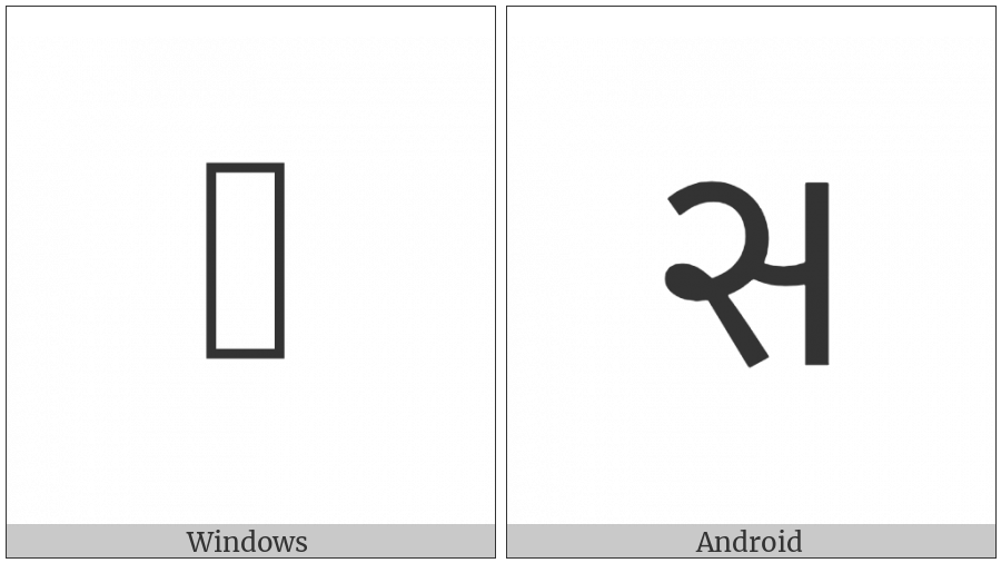 The image below shows how the “Kaithi Letter Sa” symbol might look like on different operating systems. If the font in which this web site is displayed does not contain the symbol and there is no fallback font able to render it, you can use the image below to get an idea of what it should look like.