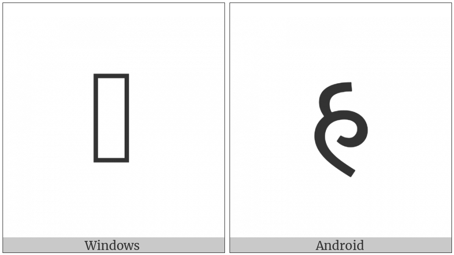 The image below shows how the “Kaithi Letter Ha” symbol might look like on different operating systems. If the font in which this web site is displayed does not contain the symbol and there is no fallback font able to render it, you can use the image below to get an idea of what it should look like.