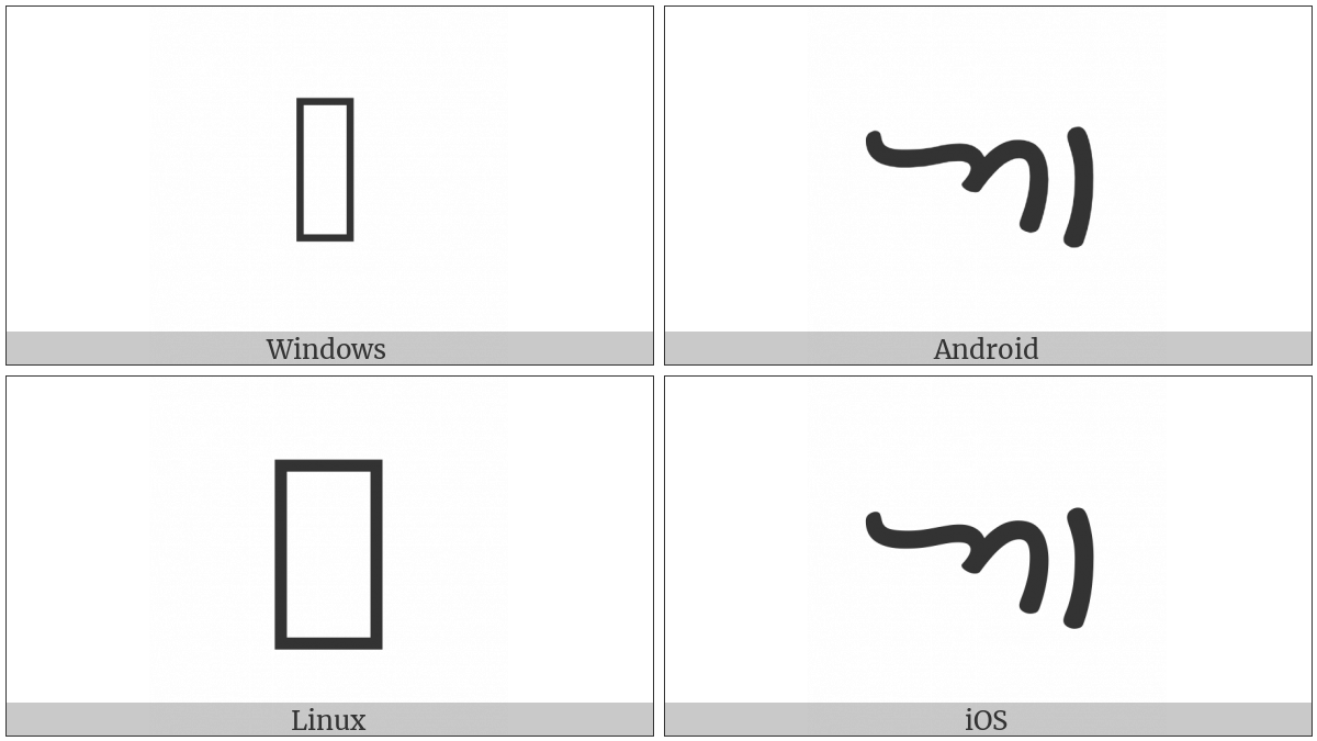 The image below shows how the “Khojki Letter Aa” symbol might look like on different operating systems. If the font in which this web site is displayed does not contain the symbol and there is no fallback font able to render it, you can use the image below to get an idea of what it should look like.