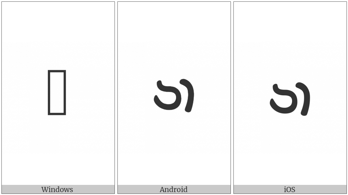 The image below shows how the “Khojki Letter Ga” symbol might look like on different operating systems. If the font in which this web site is displayed does not contain the symbol and there is no fallback font able to render it, you can use the image below to get an idea of what it should look like.