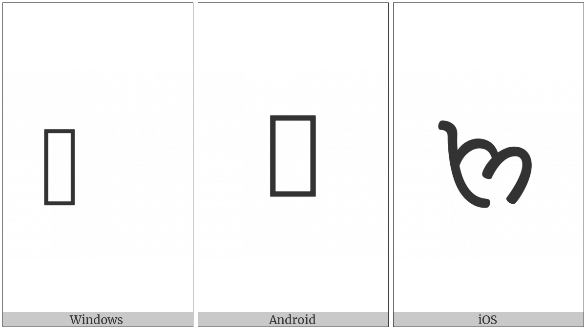 The image below shows how the “Khojki Letter Nna” symbol might look like on different operating systems. If the font in which this web site is displayed does not contain the symbol and there is no fallback font able to render it, you can use the image below to get an idea of what it should look like.