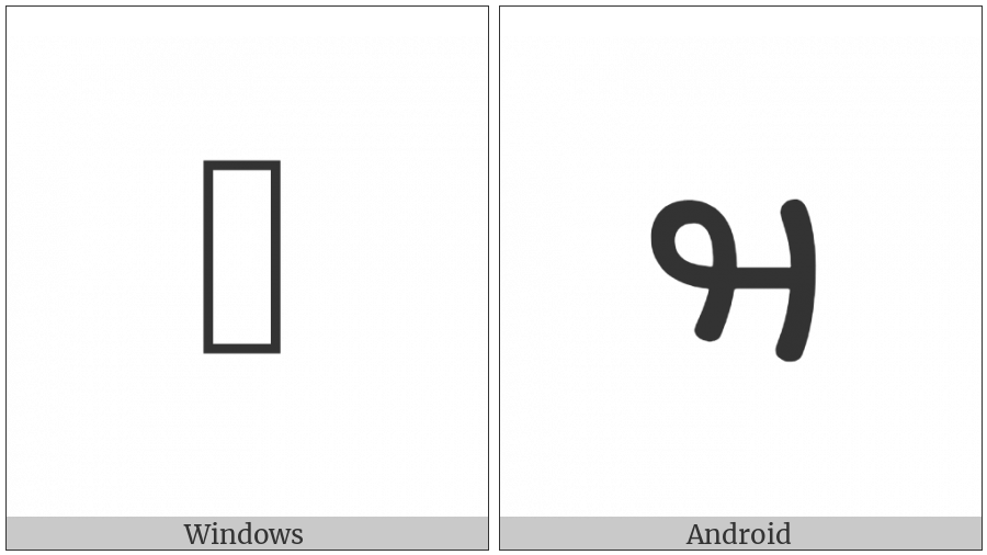 The image below shows how the “Khojki Letter Bba” symbol might look like on different operating systems. If the font in which this web site is displayed does not contain the symbol and there is no fallback font able to render it, you can use the image below to get an idea of what it should look like.
