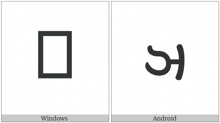 The image below shows how the “Khojki Letter Bha” symbol might look like on different operating systems. If the font in which this web site is displayed does not contain the symbol and there is no fallback font able to render it, you can use the image below to get an idea of what it should look like.