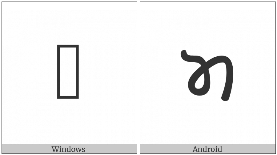 The image below shows how the “Khojki Letter Ma” symbol might look like on different operating systems. If the font in which this web site is displayed does not contain the symbol and there is no fallback font able to render it, you can use the image below to get an idea of what it should look like.