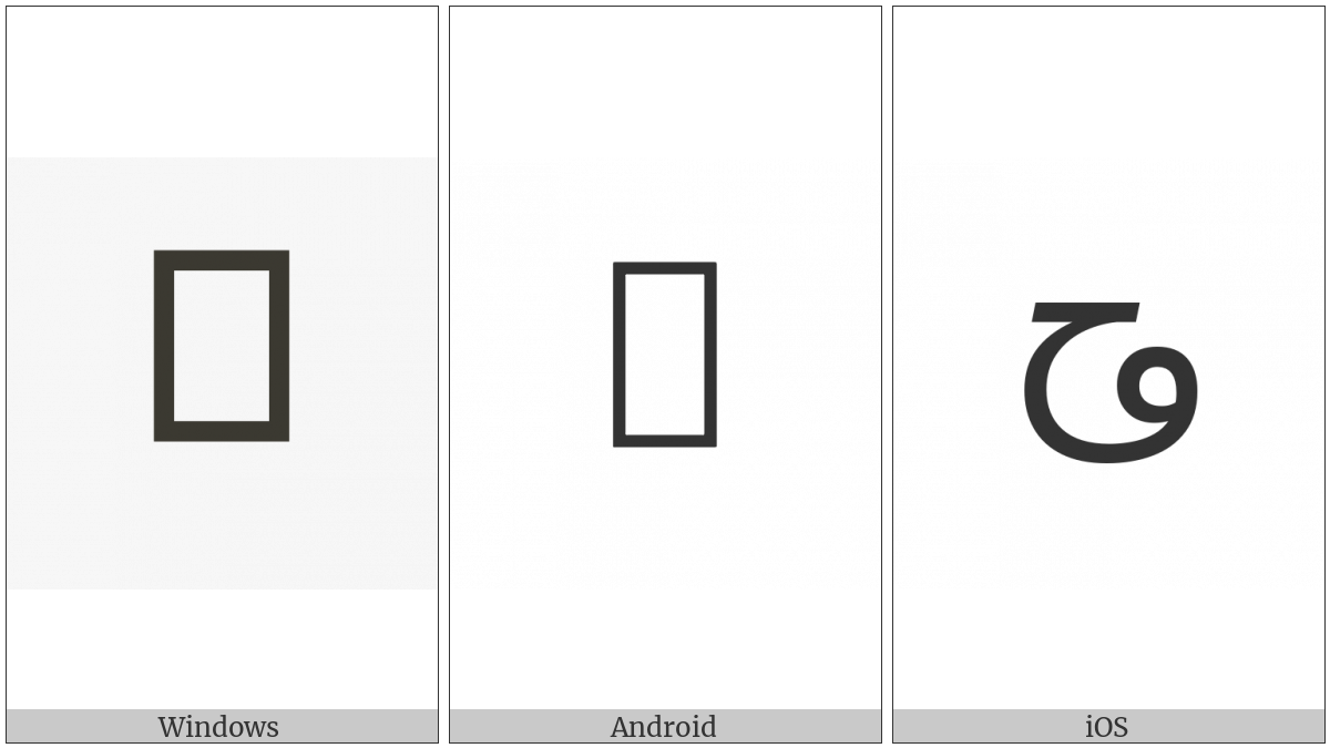 The image below shows how the “Khudawadi Letter Ddha” symbol might look like on different operating systems. If the font in which this web site is displayed does not contain the symbol and there is no fallback font able to render it, you can use the image below to get an idea of what it should look like.