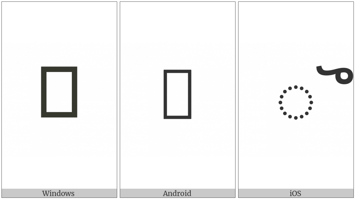 The image below shows how the “Khudawadi Vowel Sign Au” symbol might look like on different operating systems. If the font in which this web site is displayed does not contain the symbol and there is no fallback font able to render it, you can use the image below to get an idea of what it should look like.