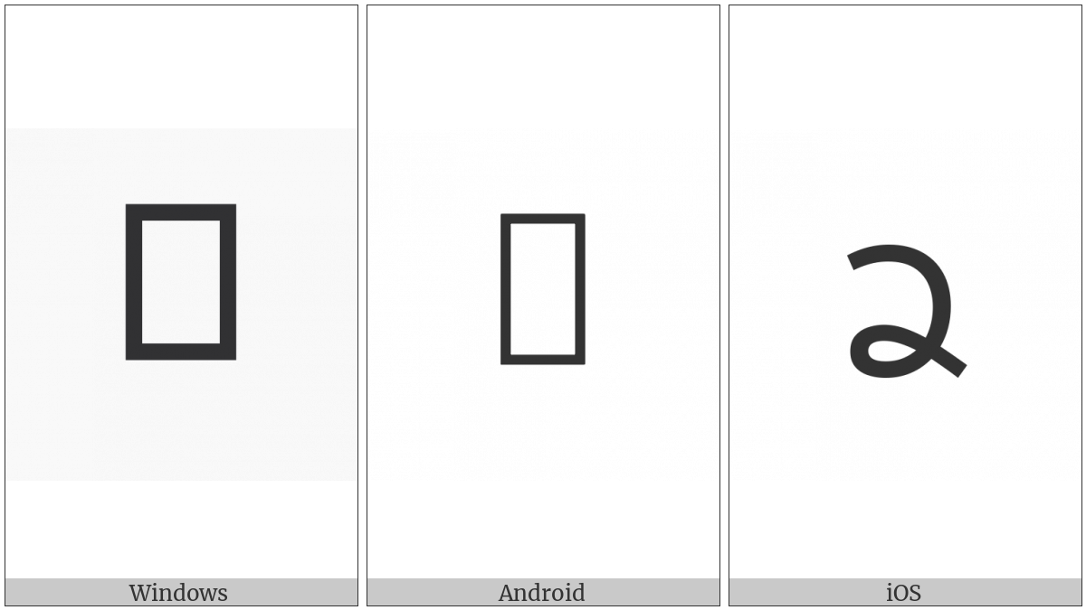 The image below shows how the “Khudawadi Digit Two” symbol might look like on different operating systems. If the font in which this web site is displayed does not contain the symbol and there is no fallback font able to render it, you can use the image below to get an idea of what it should look like.