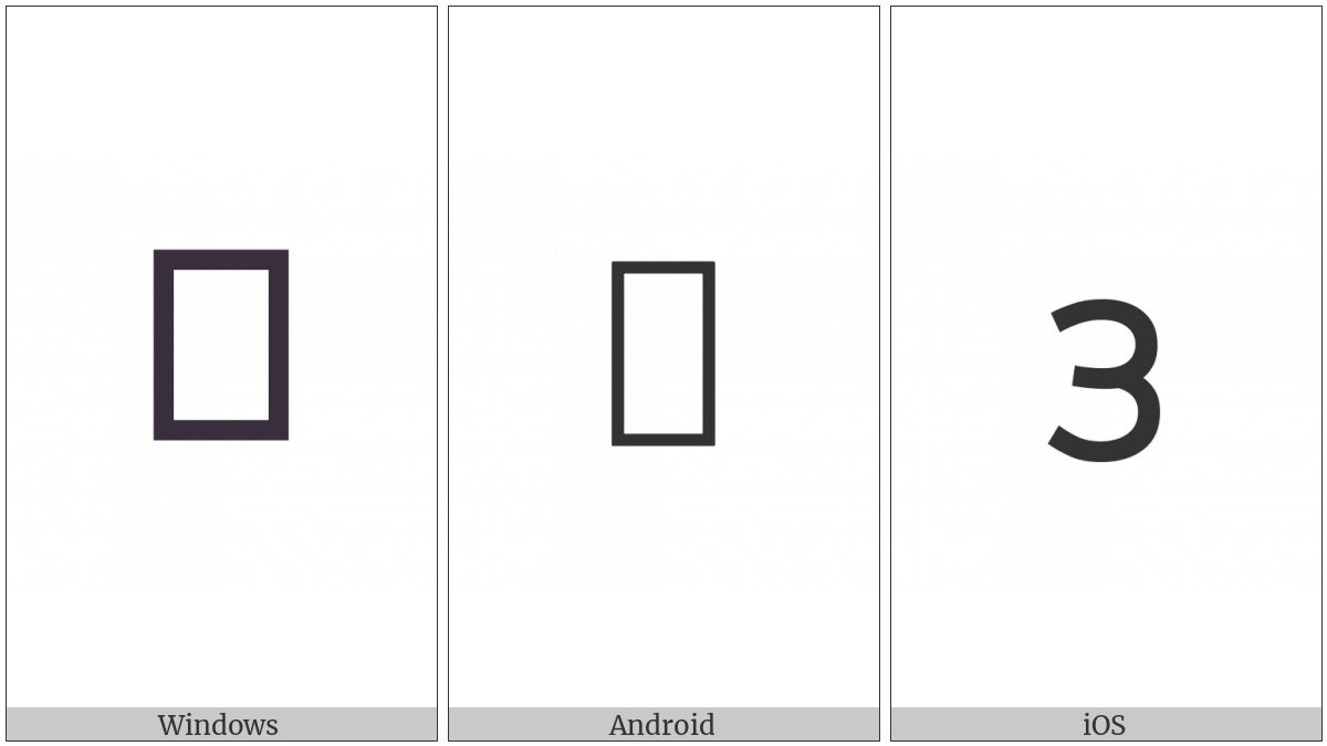The image below shows how the “Khudawadi Digit Three” symbol might look like on different operating systems. If the font in which this web site is displayed does not contain the symbol and there is no fallback font able to render it, you can use the image below to get an idea of what it should look like.