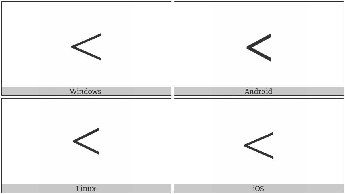 The image below shows how the “Modifier Letter Left Arrowhead” symbol might look like on different operating systems. If the font in which this web site is displayed does not contain the symbol and there is no fallback font able to render it, you can use the image below to get an idea of what it should look like.