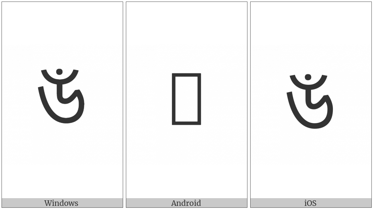 The image below shows how the “Tirhuta Letter U” symbol might look like on different operating systems. If the font in which this web site is displayed does not contain the symbol and there is no fallback font able to render it, you can use the image below to get an idea of what it should look like.