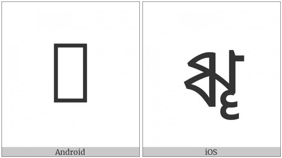 The image below shows how the “Tirhuta Letter Vocalic Rr” symbol might look like on different operating systems. If the font in which this web site is displayed does not contain the symbol and there is no fallback font able to render it, you can use the image below to get an idea of what it should look like.