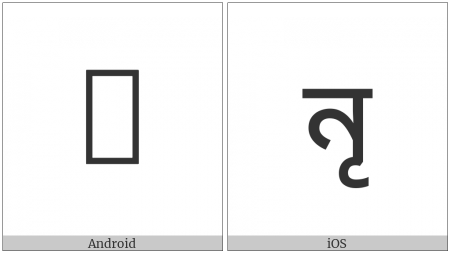 The image below shows how the “Tirhuta Letter Vocalic L” symbol might look like on different operating systems. If the font in which this web site is displayed does not contain the symbol and there is no fallback font able to render it, you can use the image below to get an idea of what it should look like.