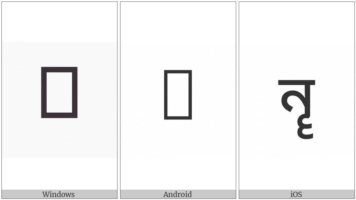The image below shows how the “Tirhuta Letter Vocalic Ll” symbol might look like on different operating systems. If the font in which this web site is displayed does not contain the symbol and there is no fallback font able to render it, you can use the image below to get an idea of what it should look like.