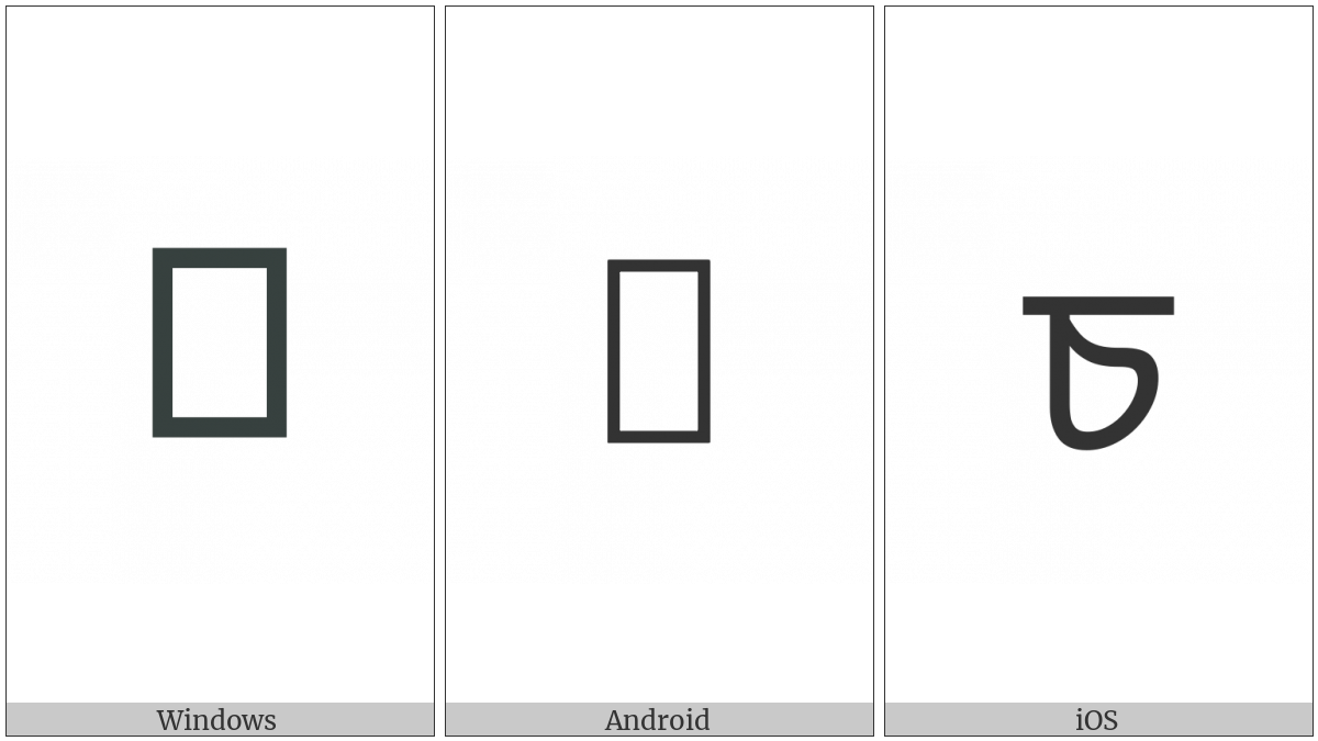 The image below shows how the “Tirhuta Letter Ca” symbol might look like on different operating systems. If the font in which this web site is displayed does not contain the symbol and there is no fallback font able to render it, you can use the image below to get an idea of what it should look like.