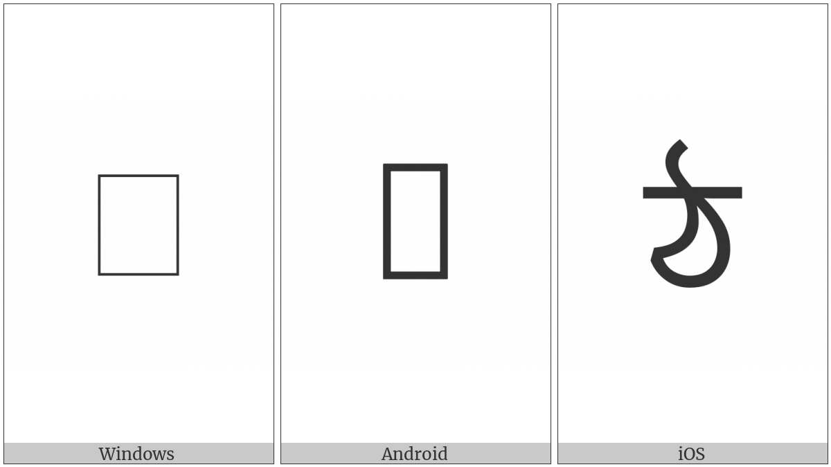 The image below shows how the “Tirhuta Letter Ttha” symbol might look like on different operating systems. If the font in which this web site is displayed does not contain the symbol and there is no fallback font able to render it, you can use the image below to get an idea of what it should look like.