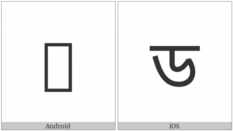 The image below shows how the “Tirhuta Letter Dda” symbol might look like on different operating systems. If the font in which this web site is displayed does not contain the symbol and there is no fallback font able to render it, you can use the image below to get an idea of what it should look like.