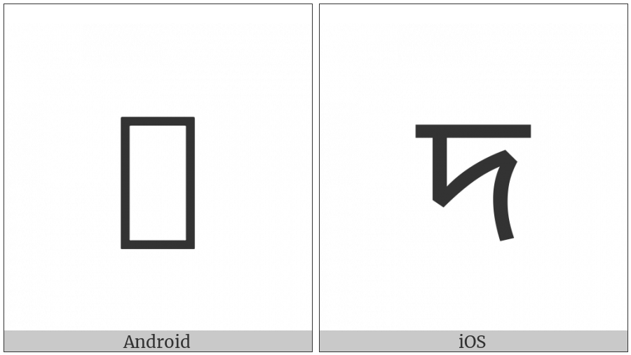 The image below shows how the “Tirhuta Letter Da” symbol might look like on different operating systems. If the font in which this web site is displayed does not contain the symbol and there is no fallback font able to render it, you can use the image below to get an idea of what it should look like.