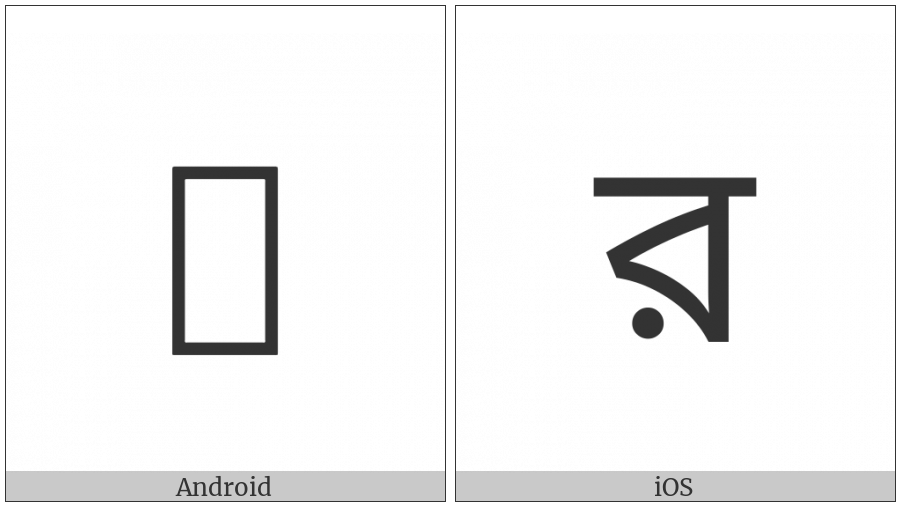 The image below shows how the “Tirhuta Letter Va” symbol might look like on different operating systems. If the font in which this web site is displayed does not contain the symbol and there is no fallback font able to render it, you can use the image below to get an idea of what it should look like.