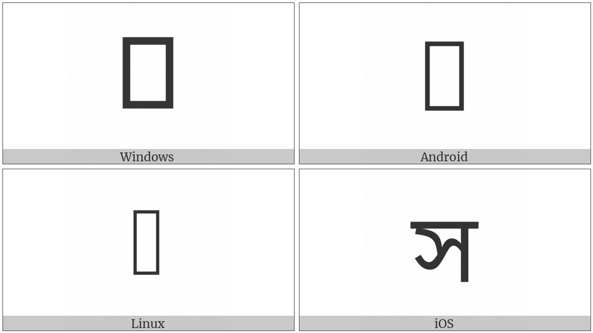 The image below shows how the “Tirhuta Letter Sa” symbol might look like on different operating systems. If the font in which this web site is displayed does not contain the symbol and there is no fallback font able to render it, you can use the image below to get an idea of what it should look like.
