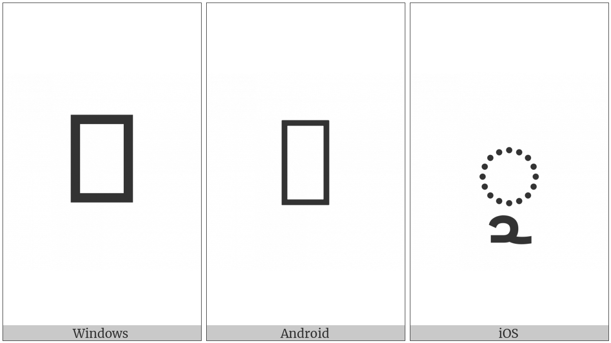 The image below shows how the “Tirhuta Vowel Sign U” symbol might look like on different operating systems. If the font in which this web site is displayed does not contain the symbol and there is no fallback font able to render it, you can use the image below to get an idea of what it should look like.