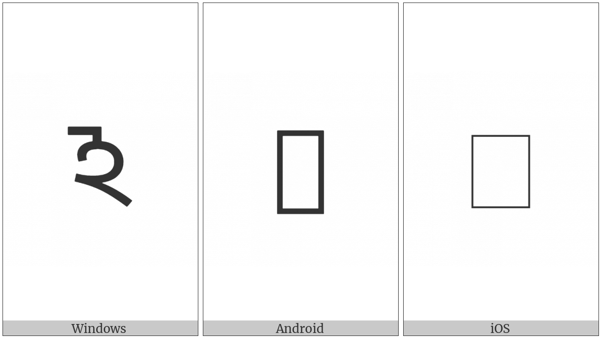 The image below shows how the “Tirhuta Sign Avagraha” symbol might look like on different operating systems. If the font in which this web site is displayed does not contain the symbol and there is no fallback font able to render it, you can use the image below to get an idea of what it should look like.