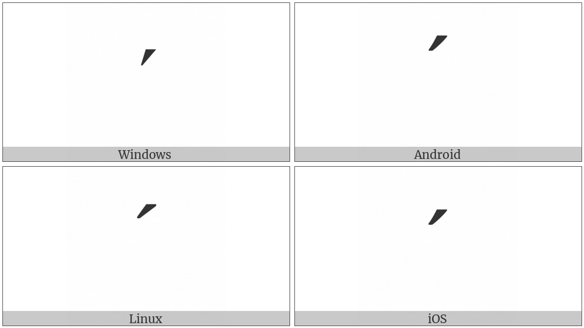 The image below shows how the “Modifier Letter Acute Accent” symbol might look like on different operating systems. If the font in which this web site is displayed does not contain the symbol and there is no fallback font able to render it, you can use the image below to get an idea of what it should look like.
