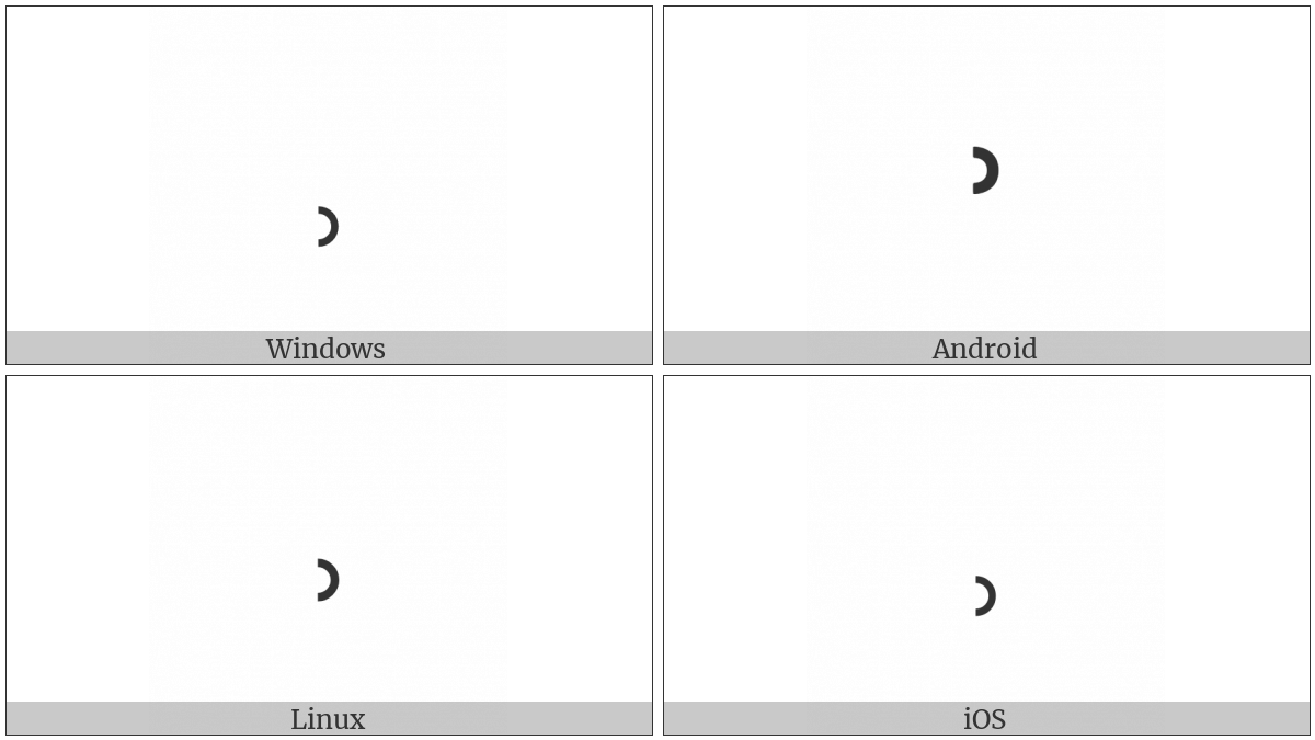 The image below shows how the “Modifier Letter Centred Right Half Ring” symbol might look like on different operating systems. If the font in which this web site is displayed does not contain the symbol and there is no fallback font able to render it, you can use the image below to get an idea of what it should look like.
