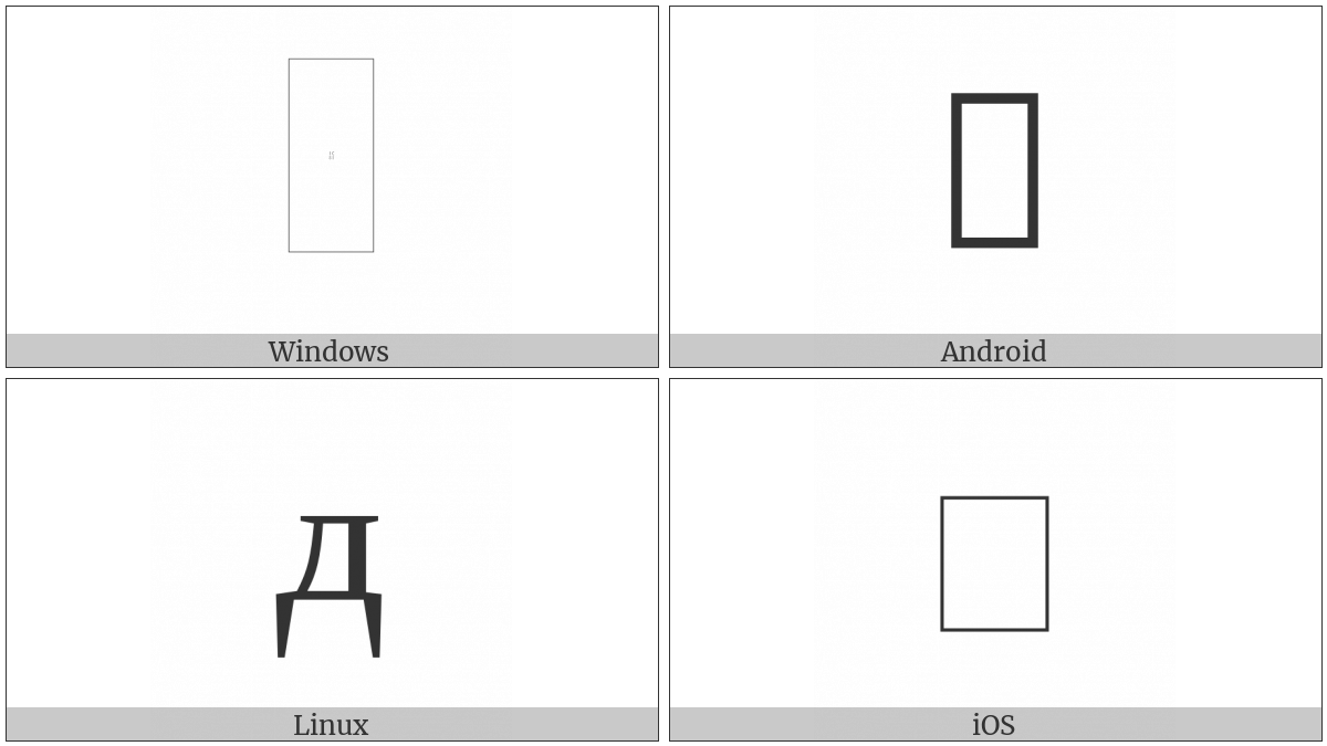 The image below shows how the “Cyrillic Small Letter Long-Legged De” symbol might look like on different operating systems. If the font in which this web site is displayed does not contain the symbol and there is no fallback font able to render it, you can use the image below to get an idea of what it should look like.