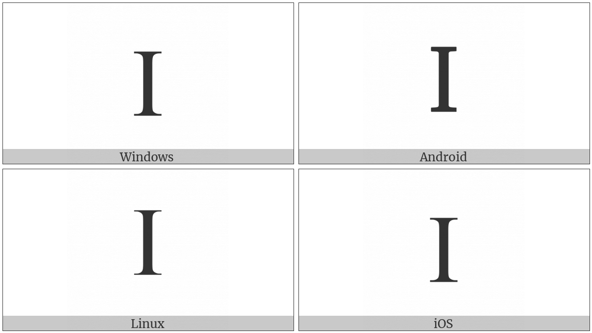 The image below shows how the “Latin Capital Letter I” symbol might look like on different operating systems. If the font in which this web site is displayed does not contain the symbol and there is no fallback font able to render it, you can use the image below to get an idea of what it should look like.