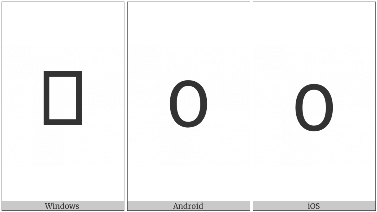 The image below shows how the “Masaram Gondi Digit Zero” symbol might look like on different operating systems. If the font in which this web site is displayed does not contain the symbol and there is no fallback font able to render it, you can use the image below to get an idea of what it should look like.