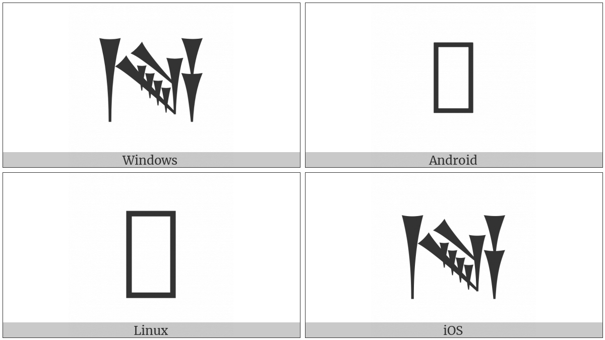 The image below shows how the “Cuneiform Sign A Times Gan2 Tenu” symbol might look like on different operating systems. If the font in which this web site is displayed does not contain the symbol and there is no fallback font able to render it, you can use the image below to get an idea of what it should look like.