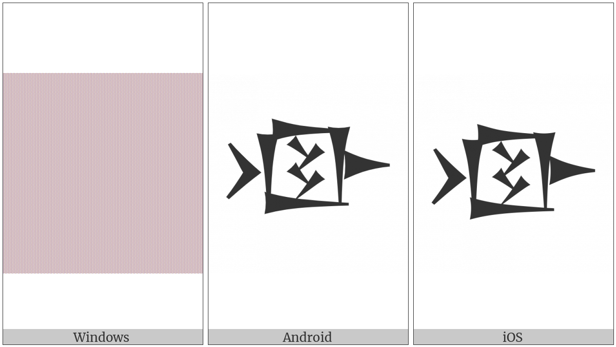 The image below shows how the “Cuneiform Sign Ak Times Erin2” symbol might look like on different operating systems. If the font in which this web site is displayed does not contain the symbol and there is no fallback font able to render it, you can use the image below to get an idea of what it should look like.