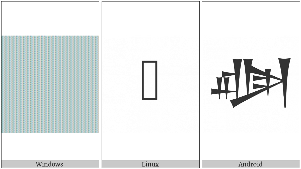 The image below shows how the “Cuneiform Sign Al Times Gish” symbol might look like on different operating systems. If the font in which this web site is displayed does not contain the symbol and there is no fallback font able to render it, you can use the image below to get an idea of what it should look like.