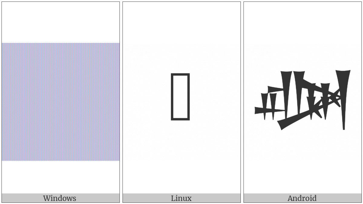 The image below shows how the “Cuneiform Sign Al Times Ha” symbol might look like on different operating systems. If the font in which this web site is displayed does not contain the symbol and there is no fallback font able to render it, you can use the image below to get an idea of what it should look like.