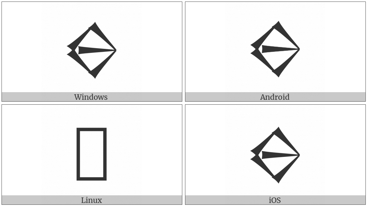 The image below shows how the “Cuneiform Sign Aleph” symbol might look like on different operating systems. If the font in which this web site is displayed does not contain the symbol and there is no fallback font able to render it, you can use the image below to get an idea of what it should look like.