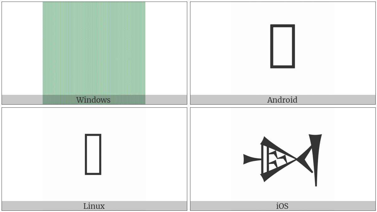 The image below shows how the “Cuneiform Sign Arad Times Kur” symbol might look like on different operating systems. If the font in which this web site is displayed does not contain the symbol and there is no fallback font able to render it, you can use the image below to get an idea of what it should look like.