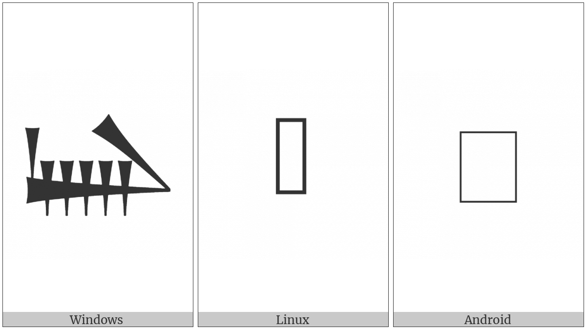The image below shows how the “Cuneiform Sign Ashgab” symbol might look like on different operating systems. If the font in which this web site is displayed does not contain the symbol and there is no fallback font able to render it, you can use the image below to get an idea of what it should look like.