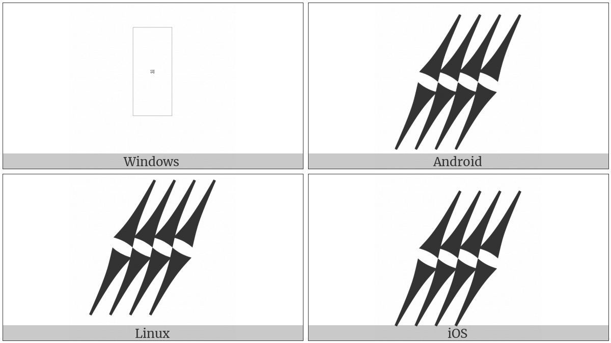 The image below shows how the “Cuneiform Sign Bag3” symbol might look like on different operating systems. If the font in which this web site is displayed does not contain the symbol and there is no fallback font able to render it, you can use the image below to get an idea of what it should look like.